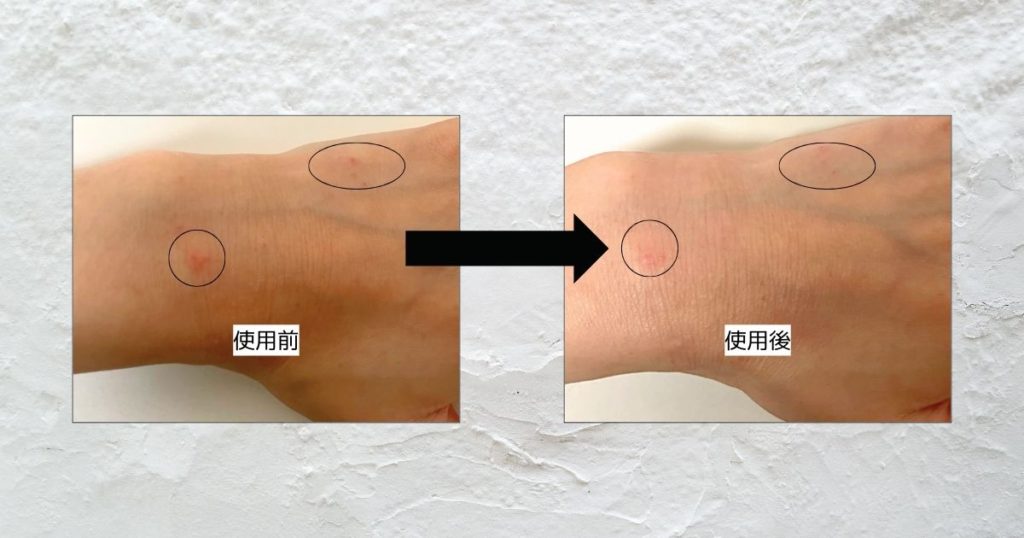 手の甲に塗ってみたところ、写真のように乾燥している箇所がしっとりしました。